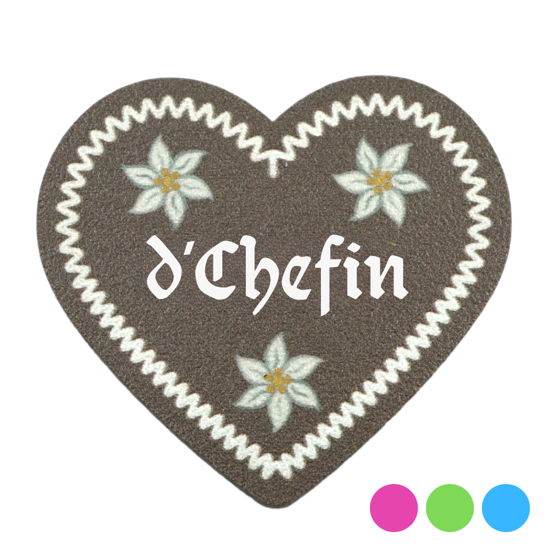 "Traditioneller bayrischer Anstecker mit dem Aufdruck 'd`Chefin'"