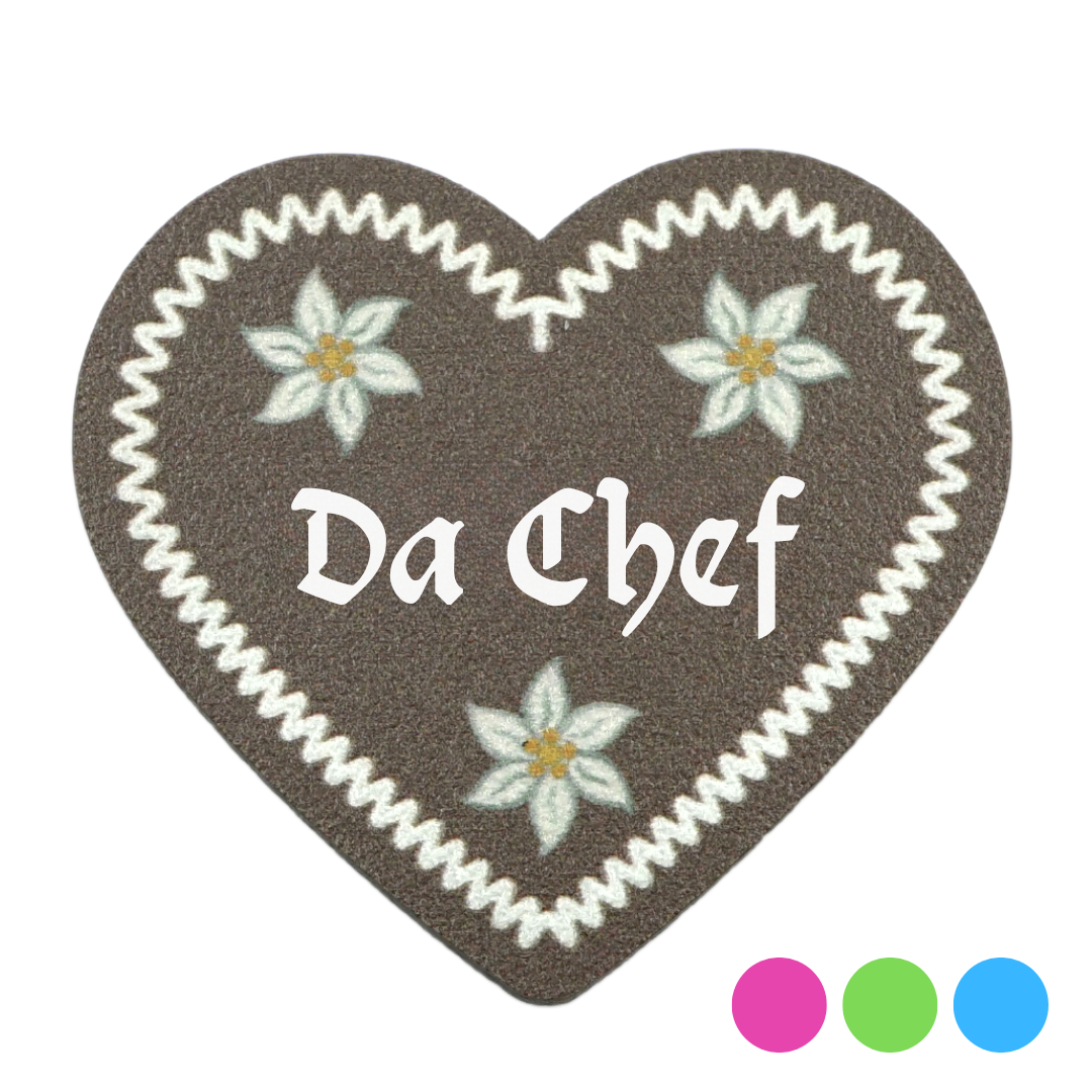 In unserem Glubbal-Online-Shop findest du die perfekte Ergänzung für deine bayrische Tracht oder das nächste Oktoberfest: unsere einzigartigen "Da Chef"-Anstecker! Hergestellt mit hochwertigen Druckverfahren und in einer ansprechenden Lebkuchen-Optik gefertigt, sind diese Anstecker ein echter Blickfang. Egal, ob du sie am Dirndl, Trachten-Jacke oder zum Lederhosen trägst, sie verleihen deinem Outfit eine traditionelle und verspielte Note.