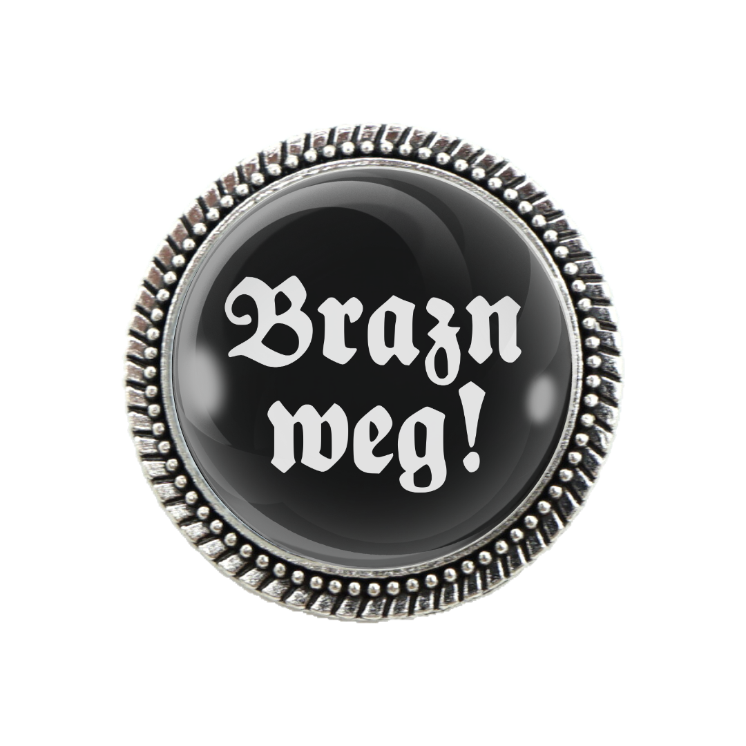 Setz a klares Statement auf jedem Festl, Volksfest oder beim Frühschoppen! Unsere Gaudibroschn in edlem Silber-Design mit dem deftigen Spruch „Brazn weg!“ ist das ideale Accessoire für Leute mit Schmäh, Stil und einer gesunden Portion bayerischem Selbstbewusstsein.