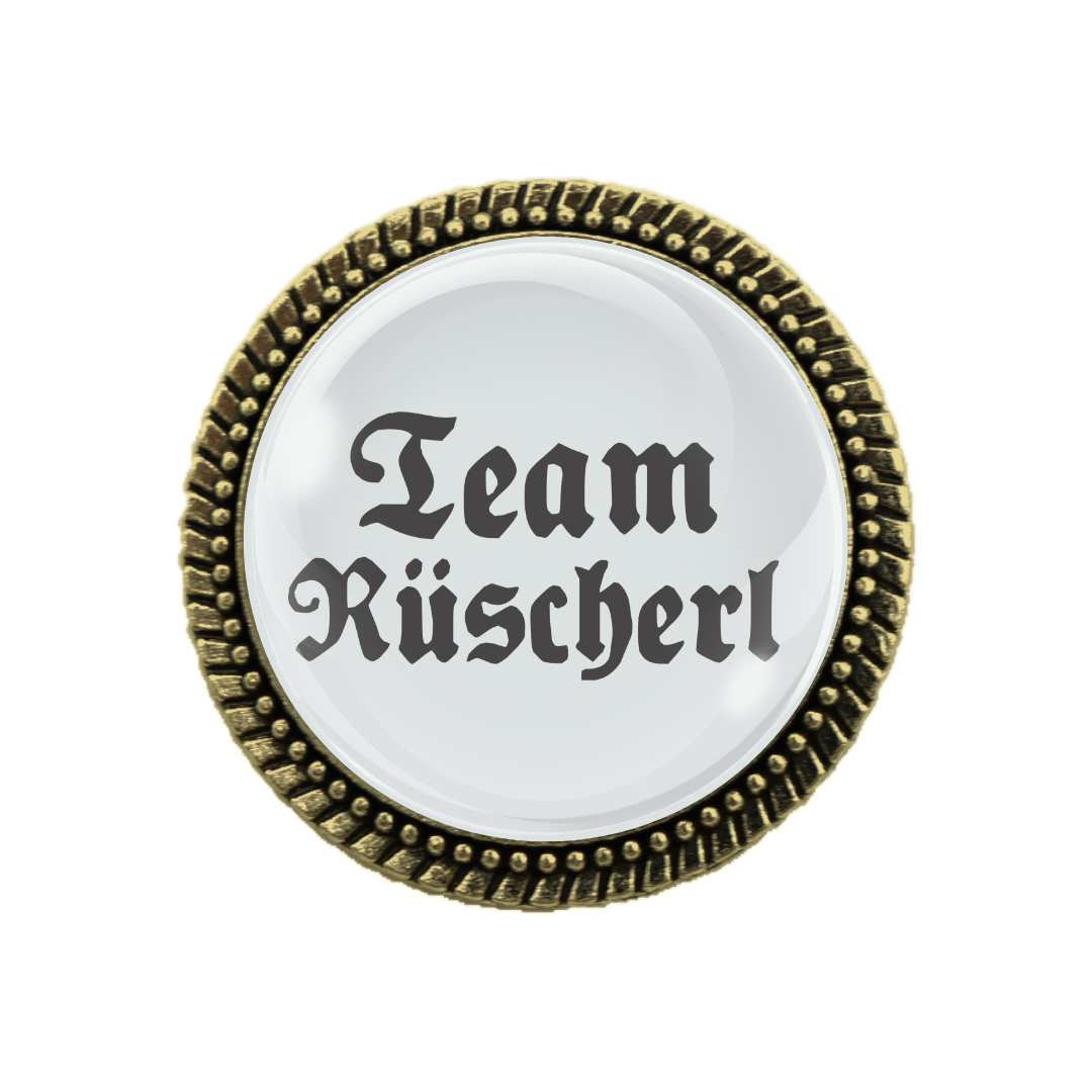 - Design: Traditionelle Trachtenbrosche mit dem witzigen Schriftzug "Team Rüscherl" – für die echte Wiesn-Gaudi.