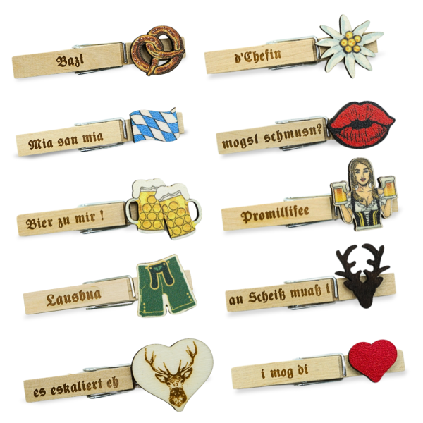 Lust auf eine Prise bayerischer Lebensfreude? Mit unserem 10er Set Glubberl ist gute Laune garantiert! Diese gravierten Holzklammern sind mit frechen Sprüchengraviert und eignen sich perfekt für bayerische Feste, Volksfeste oder einfach als Accessoire zur Tracht. Ob am Dirndl, der Lederhose oder als Dekoration für die Bierbank – unsere Glubberl sind vielseitig einsetzbar und verbreiten überall gute Stimmung.