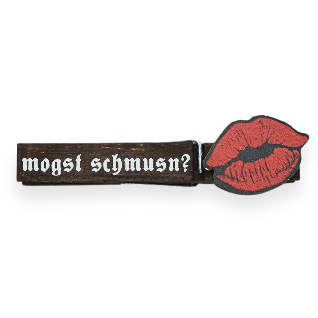 Auf bayerischen Festen und Volksfesten ist eines sicher: Es wird geschmust! Mit unserem einzigartigen 'Mogst Schmusn' Glubbal wird die Tradition des Schmusens neu belebt. Diese dunkle Holzklammer mit weißer Aufschrift ist nicht nur ein Accessoire zur Tracht, sondern auch ein Statement für alle Liebhaber der bayerischen Gemütlichkeit.