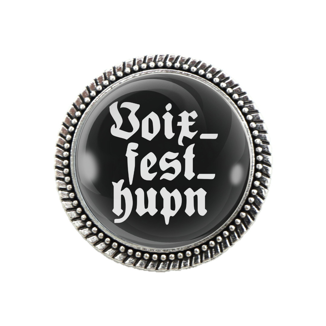 Die Pracht-Gaudibroschn „Voixfesthupn“ ist ein echter Hingucker und das ideale Schmuckstück für alle, die ihr Trachtenoutfit mit einem augenzwinkernden Statement veredeln möchten. Mit einem Durchmesser von 3 cm und einem Gewicht von 15 g liegt die Trachtenbrosche angenehm schwer in der Hand und zeugt von Qualität und Substanz. Die klassische Silberfassung umrahmt das tiefschwarze Zentrum, auf dem der bayerische Spruch „Voixfesthupn“ in weißer Schrift deutlich hervorsticht.